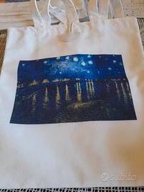 borsa 100% poliestere nuova con etichetta stampa quadro di Van Gogh Notte stellata sul Rodano tasca interna chiusura a bottone misura 34 * 36 manico 27 cm