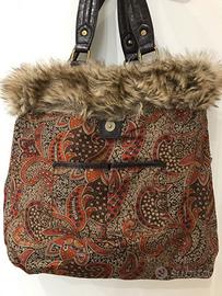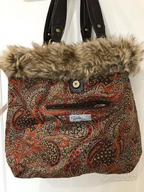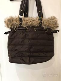 Borsa Stella Max, color cioccolato, nuova, mai usata, tessuto lavabile e resistente al aqua, pelle e pelliccia ecologiche. Al esterno presenta due tasche con cerniera e al interno una tasca grande con cerniera e due più piccole senza. Il ciondolo colorato e rimovibile