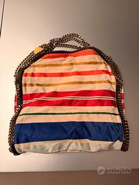 In vendita una splendida e rara borsa Stella McCartney modello Falabella Fold-Over, un vero pezzo d'archivio proveniente dalla collezione Primavera/Estate 2012 (S12). Questa edizione speciale si distingue per un vivace motivo a righe orizzontali multicolore (rosso, arancione, giallo, blu, verde) su base neutra. Un'opportunità unica per i collezionisti e gli amanti del brand di possedere un pezzo storico e audace, perfetto per dare un tocco di colore distintivo. Dettagli Chiave: Modello: Falabella Fold-Over Tote (portabile a mano piegata o a spalla/tracolla). Colore/Fantasia: Righe multicolore. Materiali 100% Cruelty-Free: Fedele alla filosofia vegana di Stella McCartney, questa borsa è realizzata in tessuto tecnico di alta qualità e poliestere riciclato. Nessun componente di origine animale. Dettagli: Bordata dall'iconica catena in metallo con finitura rutenio (canna di fucile) e medaglietta logata rotonda originale. Interno: Fodera monogram in nylon nero prodotta da bottiglie di plastica riciclate. Tasca interna con zip e targhetta "Made in Italy". Autenticità Garantita: La borsa è autentica al 100%. Le foto includono l'etichetta interna con i codici identificativi: Codice Modello: 234387 Codice Materiale: W9219 Codice Stagionale: S12 (Collezione Primavera/Estate 2012) Condizioni: Ottime condizioni vintage. La borsa è stata conservata con cura. I colori del tessuto sono ancora brillanti, la catena mantiene la sua finitura e gli interni sono puliti. Un pezzo d'archivio di oltre 10 anni fa mantenuto in modo impeccabile. Accessori Inclusi: Viene fornita con il suo dustbag originale Stella McCartney (mostrato in foto).