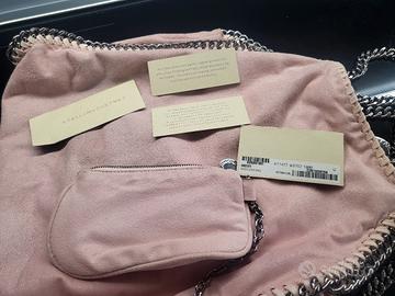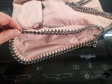 É bellissima, il colore delicato le conferisce una delicatezza come il materiale, dal tocco morbido, Le catenelle sono perfette,Dentro c'è un'altra catenina collegata al borsellino interno. Molto fortunata chi l'acquista, perché è seminuova.