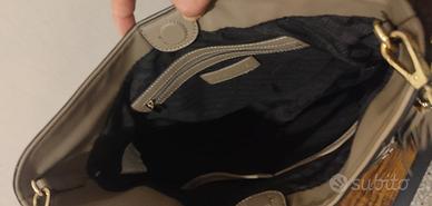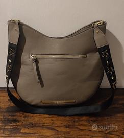 Borsa con tracolla Steve Madden, colore tortora, uno grande scomparto centrale con chiusura a calamita, e due laterali (uno con zip e l'altro con cordino). La borsa è in ottime condizioni generali, segnalo piccoli segni di usura sul bordo superiore.
