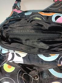 Colorata piccola borsa, con tre scomparti (2 con chiusura a magnete e uno con zip) , una tasca esterna e una interna entrambe chiuse con zip, 15x23x4 circa. Presenta scoloriture nella parte interna dei manici. come da foto