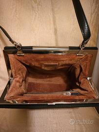 Elegantissima borsetta marca Sutor Mantelassi in tessuto nero con apertura a soffietto metallico, dotata di taschina interna con cerniera in pelle nera, interno in camoscio color cognac. Misure larghezza cm 20, h senza tracolla cm 20, con cm 46.