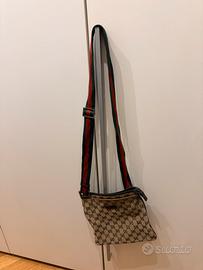 Borsa a tracolla Gucci con monogramma classico e tracolla verde-rossa. In buone condizioni, leggeri segni d’uso. Autentica, perfetta per uso quotidiano o collezione vintage.