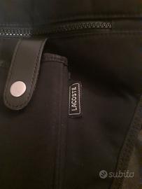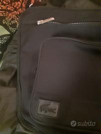 borsa tecnica piatta in tessuto impermeabile a tracolla Lacoste con tre tasche, porta e ferma occhiali per mezzo di fascetta in velcro, manico regolabile con rinforzi in pelle, colore nero