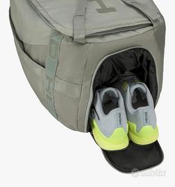 Descrizione: Vendo capiente borsa sportiva HEAD color grigio chiaro con dettagli verde acido. Perfetta per tennis o padel. • Capacità: Ampio scomparto principale che può ospitare diverse racchette (vedi foto). • Extra: Tasca laterale separata e ventilata per le scarpe (fondamentale per non sporcare i vestiti!). • Trasporto: Spallacci regolabili per usarla come zaino o borsa a mano. Usata pochissimo, condizioni eccellenti, zip perfettamente funzionanti.