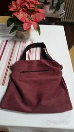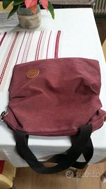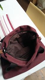 Borsa in tessuto pesante bordeaux (forse cotone) con due manici in fettuccia pesante, portabile a spalla. Misure 38 cm x 38 cm circa. Foderata in tessuto color marrone. Tasche all'interno + una tasca esterna con cerniera. Usata pochissimo.