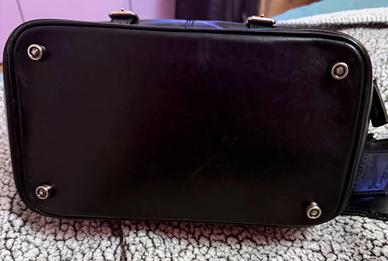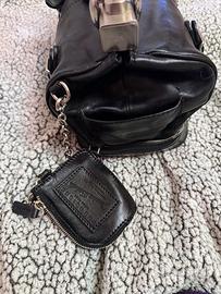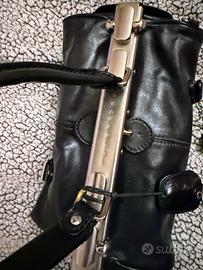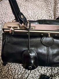 Borsa in cuoio , particolare ,di grandezza media ma molto capiente. Sul fondo c’è uno scomparto ed il portafoglio assicurato con una catena su un lato si può staccare. La metalleria è color argento satinato. Mai usata in condizioni perfette.