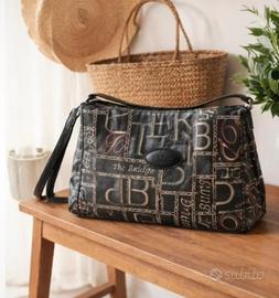 Borsa The Bridge originale, modello a spalla, in ecopelle con fantasia logata su tutta la superficie. Colore principale nero con dettagli chiari e scritta “The Bridge” visibile sul fronte. Chiusura superiore con zip, interno capiente, perfetta per uso quotidiano.