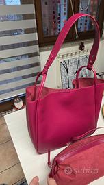 Vendo x inutilizzo bellissima borsa firmata THUN, assolutamente nuova e mai utilizzata. La borsa è realizzata in pregiata pelle sintetica con texture martellata, in una vivace e raffinata tonalità di rosso magenta/lampone. Il design è estremamente funzionale: si tratta di una borsa "2 in 1" che include all'interno una seconda borsa/pochette estraibile in tessuto scamosciato coordinato, dotata di chiusura a zip e tracolla propria. Perfetta per tenere al sicuro gli oggetti personali o da usare separatamente. DETTAGLI E MISURE: Marca: THUN (logo metallico dorato sul fronte) Stato: Nuova, mai usata Colore: Magenta / Rosso Lampone Dimensioni corpo borsa: Altezza: circa 30 cm Lunghezza (base): circa 32 cm Larghezza (profondità): circa 13 cm Caratteristiche: Doppi manici regolabili con borchie dorate, interno spazioso, include pochette interna con cerniera. Borsa elegantissima e versatile, ideale sia per il lavoro che per il tempo libero. Un'ottima idea regalo!