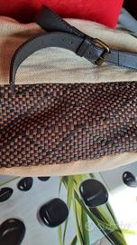 -A secchiello con chiusura con coulisse In tela di yuta nella parte superiore e intrecciata quadretti in pelle marrone e camoscio nella parte inferiore