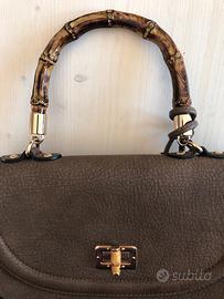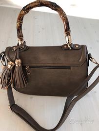 Borsa tipo Kelly con nappine e manico e chiusura simil bambu Colore tortora Misura 20x30 Leggermente rovinata alla base lato dx come da foto