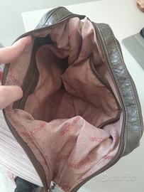 Borsa color tortora a mezzaluna acquistata a Particolari. Ha tracolla e tasche interna ed esterna. Materiale effetto pelle in rilievo.