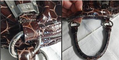 Borsa Tosca. Misure: lunghezza totale con manici 44 cm. Solo manici 14 cm. Larghezza 40 cm, profondità 19 cm. Usata, ma ancora bella nonostante qualche imperfezione visibili in foto. Guardate bene le foto, manca anche il ciondolo che era attaccato alla chiusura. Interno perfetto.(n.3135)