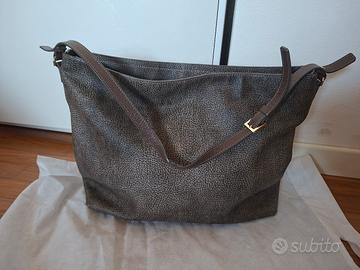 Borsa Borbonese A Spalla in pelle misure 40x30x15 cm, qualche segni di usura sugli angoli, all'interno perfetta. Dettagli in pelle. colore marrone/tortora