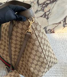 La borsa Gucci Giglio GG Denim Tote è realizzata in tela denim scura con il classico monogramma GG e dettagli in fettuccia rossa e verde, per un look retrò ma elegante. Le dimensioni ridotte offrono una capienza moderata, rendendola adatta sia al lavoro che alle occasioni casual. Presenta dettagli in metallo GG e una tracolla regolabile, che consente di indossarla facilmente a mano o a spalla. Il denim, resistente e di facile manutenzione, è un must per gli outfit autunnali e invernali dai colori scuri, valorizzando il tuo stile senza sforzo. È un articolo popolare che unisce funzionalità e stile!