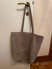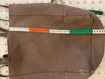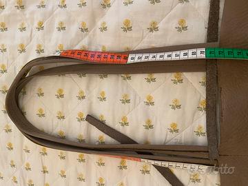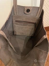 Usata un paio di volte. Cm 40 x 30 x 15 profondità, chiusura con calamita e laccetti. Lunghezza Manici cm 78. Pelle scamosciata artigianale