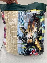 Borsa shopper capiente e leggera in tessuto mesh plastificato, con stampa floreale e animalier. Tasca interna con cerniera Uno scomparto Doppio manico da portare a mano o a spalla Tessuto testurizzato, ricoperto da una plastica trasparente per un effetto lucido e molto particolare poliestere riciclato Misure Altezza senza manici 35 cm, larghezza 27 cm, spessore 8 cm. Manici alti 23 cm Condizioni discrete, usata poco ma manca il bottone di chiusura (vedi ultima foto)