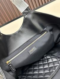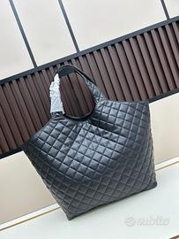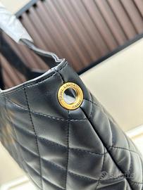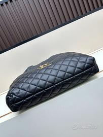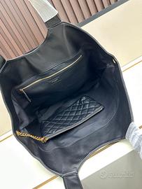Il monogramma 3D è presente al centro della nappa. Catene metalliche collegano le due estremità della borsa e la borsa contiene una piccola pochette che può essere utilizzata anche da sola.