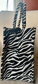 Borsa in tessuto rigida, motivo zebrato, con possibilità di tracolla allungabile e rimovibile. Cerniera di chiusura e taschino interno