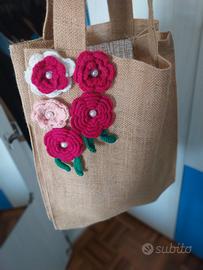 In juta naturale con fiorellinii fatti a mano all uncinetto in lana di alta qualità. Robusta e capiente. Misure 38×33×11 cm