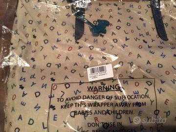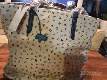 Borsa a tracolla Radley New Oilskin Alphabetti Spaghetti Large Zip Top. RRP €155. Elegante e spaziosa, questa borsa da viaggio presenta il cane Radley nel design con stampa alfabetica. La base strutturata la rende perfetta per mantenere al sicuro i tuoi dispositivi, mentre le maniglie e le rifiniture in pelle blu navy la completano. È dotata di una chiusura superiore sicura con zip e un tirante in pelle. Ha una tracolla regolabile in tessuto di cotone con rifiniture in pelle tono su tono. Sulla parte anteriore c'è una tasca a soffietto e un motivo in pelle del cane Radley staccabile. L'interno è dotato di una tasca con zip sicura e due tasche per il cellulare, con rifiniture in pelle e motivo Radley. C'è anche una tasca a soffietto con chiusura a pressione con linguetta in pelle. Dimensioni: Altezza: 34 cm, Larghezza: 39 cm, Profondità: 11 cm. Condizioni: Nuova con etichetta.