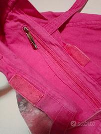 Shopping bag di tela rosa con stampa barboncino, marca Sisley. La borsa è usata ma in buone condizioni, capiente , con un taschino interno con zip e un taschino piccolo in alto. Chiusura con velcro. È stata lavata varie volte.
