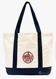 Dimensioni della borsa 52,1 cm di larghezza x 36,8 cm di altezza x 14,6 cm di profondità con logo Trader Joes ricamato.