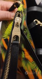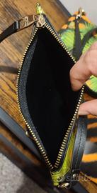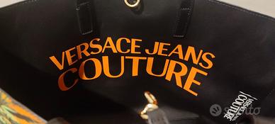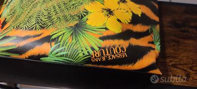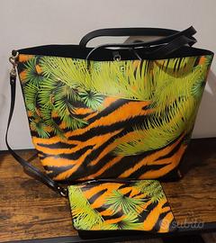 Borsa tote Versace Jeans Couture con stampa della giungla, fantasia tropicale e tigrata, chiusura con moschettone,completa di pochette coordinata con zip. Borsa in cotone con spalmatura in resina di poliuretano e poliestere (similpelle). Accessori in metallo color oro. Design vivace e colorato. Segnalo che l'etichetta interna si è staccata per fare le foto, ma è presente. Misure 40 x 16 x h 30 cm.