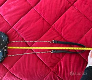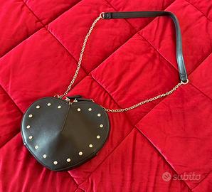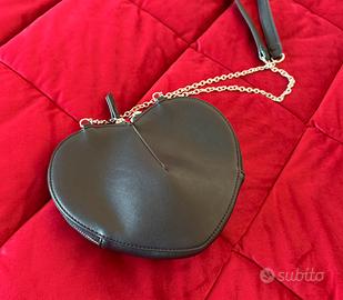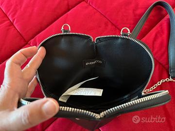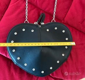 Borsa a Tracolla Cuore Nero Even&Odd - Dettagli Strass Vendo deliziosa borsa a tracolla firmata Even&Odd, caratterizzata dall'originale forma a cuore. Perfetta per dare un tocco romantico e sbarazzino a qualsiasi outfit, ideale anche come idea regalo. • Design: A forma di cuore, in similpelle nera di alta qualità. Il perimetro anteriore è impreziosito da luminosi punti luce/strass incastonati, che creano un bellissimo contrasto. • Dettagli Tecnici: Chiusura a doppia zip argentata che segue la forma del cuore. All'interno è presente la fodera nera originale con l'etichetta del brand "Even&Odd" e l'etichetta dei materiali/cura (vedi foto). • Tracciola: Mista catena argentata e passante in similpelle nera per un maggiore comfort sulla spalla. La tracolla è removibile grazie ai moschettoni. • Dimensioni (vedi foto con metro): • Larghezza massima del cuore: circa 20-21 cm. • Lunghezza totale della tracolla (compresa la parte in catena): circa 50-51 cm (misura presa piatta, come da foto). • Stato dell'oggetto: La borsa è in ottime condizioni, come nuova. Non presenta segni di usura, graffi sulla similpelle o strass mancanti. L'interno è pulito e impeccabile. È stata conservata con cura in un ambiente privo di fumo.