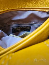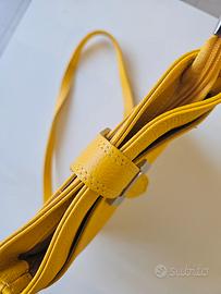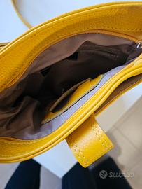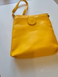 Vendo borsa a tracolla in pelle martellata color giallo, made in Italy. La pelle è morbida con texture granulata e la chiusura è caratterizzata da una placca metallica con calamita. Dispone di tracolla regolabile. Le dimensioni sono circa 24 x 25 cm, compatte e pratiche per l'uso quotidiano. Condizioni: buone, come nuova. Usata davvero solo un paio di volte. Disponibile per spedizione o ritiro a mano.