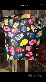 Borsa a tracolla Fiorucci Matrioska (da collezione), in forte plastica doppiata all'interno in tessuto nero; tracolla estendibile in tessuto tecnico con logo continuo; misure 34x30, fondo cm 7. Angoli usurati. Svendo a 25 euro