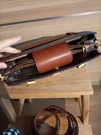 Borsa rigida elegante e capiente con tre scomparti (uno con zip), taschino interno ed esterno.