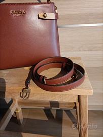 Borsa a spalla Guess con dettagli in oro. Borsa da spalla rigida con manico e tracolla rimovibili e intercambiabili. Borsa rigida color mattone, marrone aranciato.