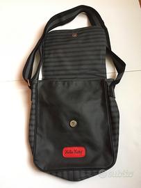 Tracolla Hello Kitty originale, in similpelle colori nero/ grigio scuro. Dimensioni 27 X 20 cm, rivestita internamente con fodera colorata con piccoli funghi, tasca interna. Morbida, comoda e flessibile. Tracolla robusta e regolabile. Nuova, mai indossata