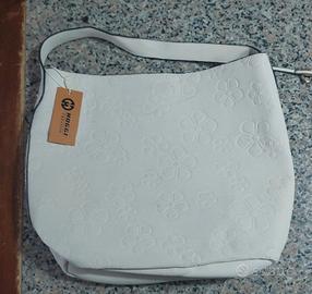 Colore bianco crema in ecopelle morbida con rilievo fiori (margherite), bordi neri a contrasto, tracolla regolabile con fibbia, anello decorativo dorato, chiusura snap/magnetica.