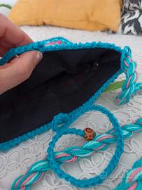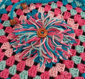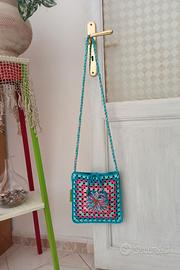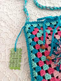 Borsa a tracolla Inventatilla 3510 in filato di cotone italiano multicolor, realizzata all'uncinetto con maxi quadrato in stile Granny e tracolla a cordone, foderata internamente con tela nera, nuovissima e pezzo unico per uno stile hippie.
