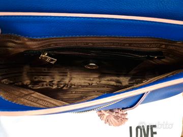 Borsa tracolla Love Moschino in similpelle bottalata blu, con rifiniture rosa antico.