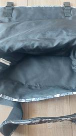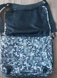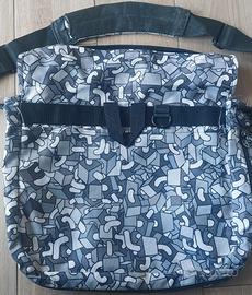 Borsa tracolla orizzontale del marchio Comix, distribuita da Franco Cosimo Panini Editore. Presenta un motivo geometrico in tonalità di grigio, bianco e nero.