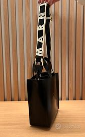 Manici in pelle e tracolla in nastro regolabile e rimovibile con scritta bianca Marni jacquard. Fodera a coulisse con tasca interna. Logo Marni color oro sul davanti.