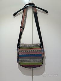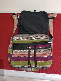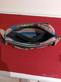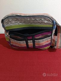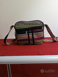 borsa tracolla regolabile in stoffa con patella, chiusura superiore con zip, tasca grande interna con zip, tasca grande esterna con zip e due piccole, una con zip una senza.