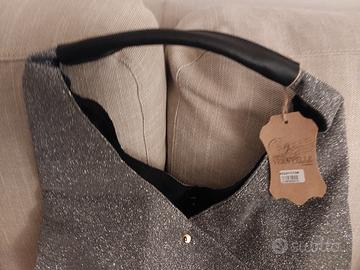 borsa tracolla in tessuto lurex color argento con manico in pelle nera, chiusura interna con bottone automatico, tasca interna con lampo + 2 taschine, fodera interna colore nero, completa di sacca originale per incarto.