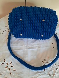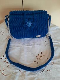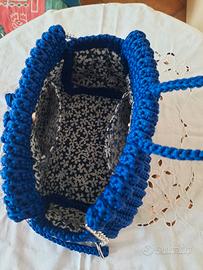 Borsa con tracolla in catena di metallo e cordino blu, lavorata ad uncinetto. Accuratamente foderata con tessuto in cotone con taschine interne. Ottime finiture