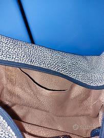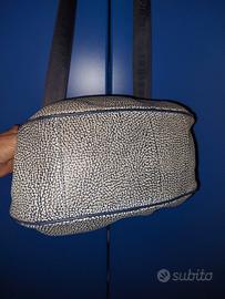 Borsa Borbonese mezzaluna media, in tapiro, con rifiniture blu. Misure 32x21 (12 profondità). All'interno sono presenti una tasca con cerniera e una senza cerniera. Conservata bene, nessun segno esterno e interno in buonissimo stato.