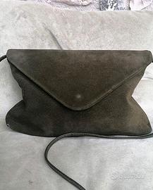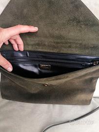 Borsa a tracolla modello busta da lettere, color verde oliva, scamosciata con interni in pelle nera, marchio lexia pel (pelletterie toscane), made in italy