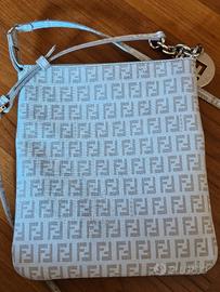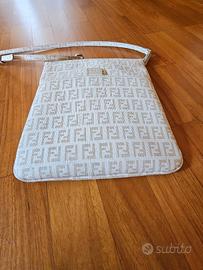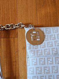 Borsa baguette Zucchino Fendi. Borsa in cambat a tracolla con tracolla lunga regolabile e accorciabile. Modello speciale esclusivo con tracolla con terminale a catena sul lato fisso e ciondolo aggiuntivo Fendi . Cerniera in ottime condizioni . Interno in tessuto marcato Fendi. Modello vintage in ottimo stato. Usato pochissimo e senza segni di usura sul corpo e sulla tracolla.
