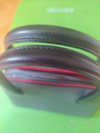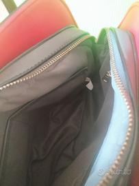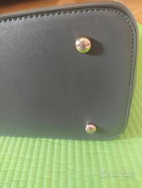 Borsa in pelle grigia con cerniera e manici neri, laterale interno rosso. All'interno una tasca con cerniera e due taschine aperte. Usata pochissimo