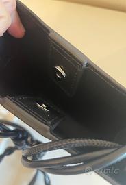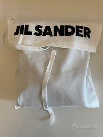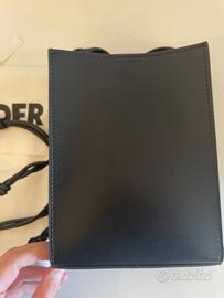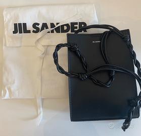 Borsa Tangle a tracolla e a spalla piccola in pelle nera con tracolla annodata a mano e logo Jil Sander goffrato: -tracolla annodata a mano -forma rettangolare -chiusura magnetica con bottone -fodera in nappa -logo Jil Sander goffrato -100% pelle di vitello -prodotto in Italia Altezza 19cm ,larghezza 14 cm e profondità 5cm. Prezzo di vendita 750€.