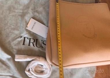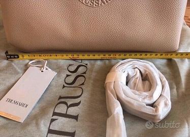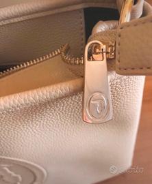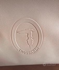 Borsa a spalla. Fornita anche di tracolla ancora imballata. Trussardi Colore beige con metalleria oro. Angoli inferiori leggermente segnati come si vede in foto (dal vivo si vedono poco ed indossata non si notano); per il resto perfetta! Fornita con cartellino di autenticità e dust bag originale. Misure in foto. #trussardi
