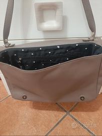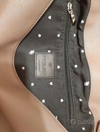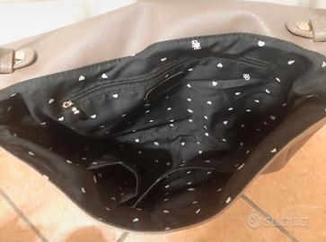 comoda borsa a spalla, morbida e leggera, cuore in paillettes, 2 tasche piccole interne e una più grande con zip, chiusura con 2 bottoni magnetici. piccolo difetto sul retro (visibile in foto). misure circa 35cm×7cm×24cm